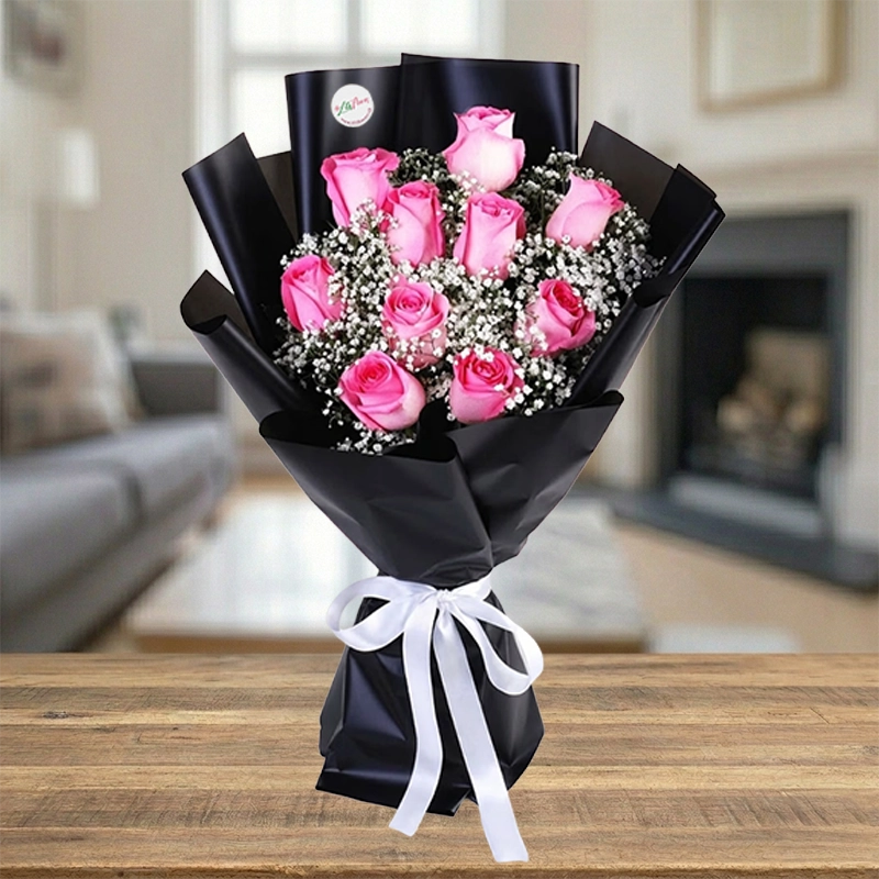 The Blush Noir Bouquet is the ultimate statement of modern elegance and sophisticated floral design. First and foremost, this stunning arrangement redefines traditional gifting by pairing soft, premium pink roses with the bold contrast of professional black floral wrapping. Furthermore, the delicate addition of Gypsophila creates a romantic texture that balances the contemporary aesthetic perfectly. If you are looking for a gift that stands out, the Blush Noir Bouquet is consequently the best choice for style-conscious recipients.