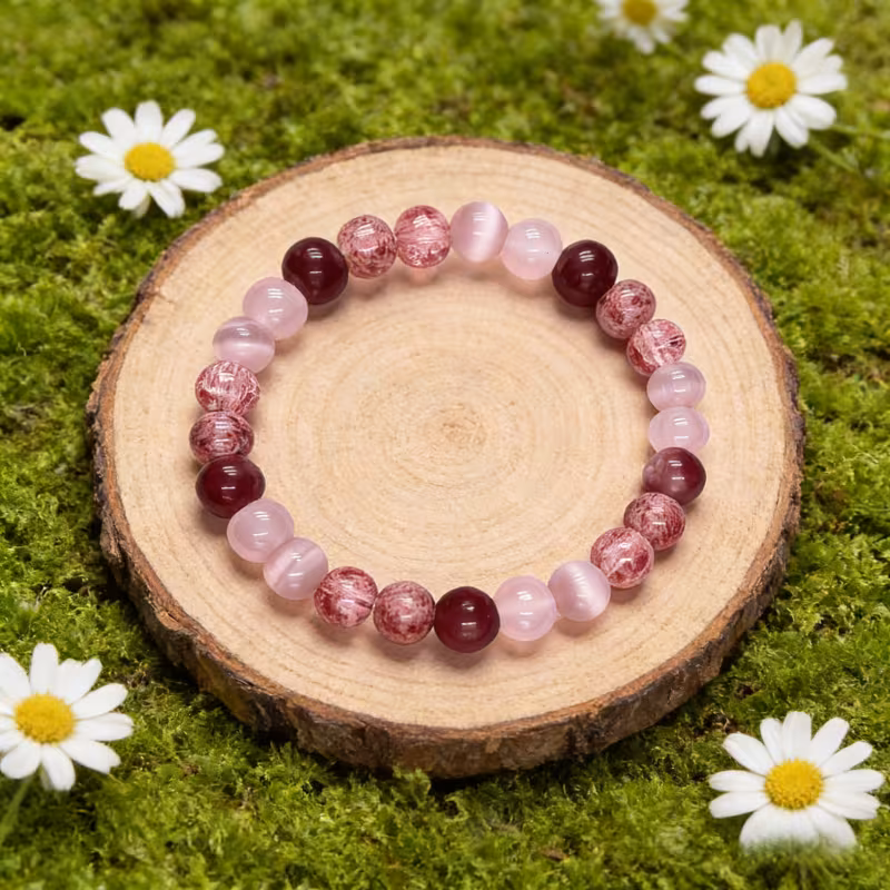 This Pink Heart Cat’s Eye Bracelet offers a beautiful way to bring more love and positivity into your life. First of all, we crafted this exquisite piece with a mix of natural gemstones. It features soft Rose Quartz, vibrant Red Jasper beads, and a stunning heart-shaped cat’s eye center stone. These stones are famous for attracting luck and positive energy. Therefore, it makes a deeply meaningful anniversary gift or a romantic surprise for ladies in Chester.